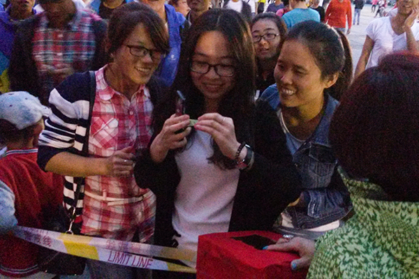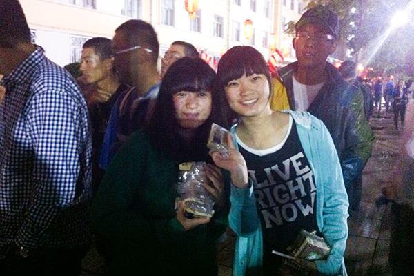 奥列霍夫广场的七、八公寓门前,满是公寓教工细心布置的红色灯笼和灯谜。学生们成群结队地聚集在一起,温馨喜气的氛围环绕着整个广场。兑奖现场更是挤满了学生,部分教工也带着孩子在跃跃欲试。为提升本次晚会的情趣和神秘感,晚会每隔半小时还特设了第二次抽奖活动。如果一人被抽中,全寝同学将同时获奖――这叫一人得“智”,“全家”团圆幸福。因此,此环节更是异常火爆。许多学生争先恐后地尝试手气,学生们都说:这样的活动很有意思,很快乐。