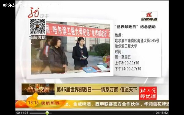 10月9日,是第46届世界邮政日,后勤集团邮政中心联合哈尔滨市邮局在奥列霍夫广场举办了以“服务师生员工”为主题的世界邮政日活动,新闻夜航对此次活动进行了报道。