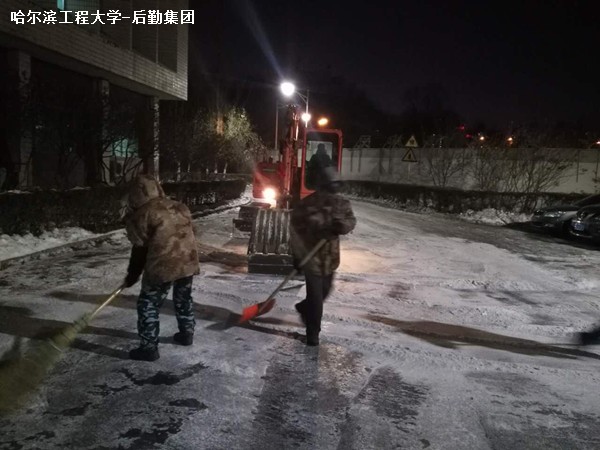 2016年11月10日哈尔滨今冬首场大雪拉开序幕,由于本轮降雪时间长,气温变化幅度较大,前期降雪、中期雨夹雪,致使路面呈湿滑状态,为学校清冰雪工作带来极大挑战。后勤集团绿化中心承担着校园主干道的清雪任务,雪情即是命令,绿化中心员工分秒必争,全员奋战在清冰雪一线。在前期完成校园主干道清雪任务的基础上,为了让全校师生有一个安全的出行环境,绿化中心主动承担起学生分担区内人员密集出行区域的清雪任务。11月13日,后勤集团出动了16台挖掘机,3台装卸机,50余人连续奋战20余小时,即使14日凌晨出现降雨,气温非常低,员工们依然顶着风雪雨水,清雪工作一刻也未停歇。直到14日凌晨6点,员工们才稍事休息,但上午又马不停蹄的投入到新一轮的清雪工作中去。