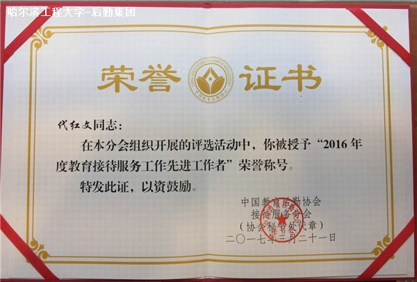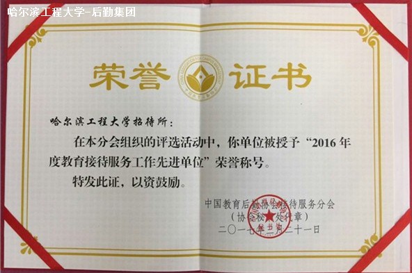 2017年3月21日,中国教育后勤协会接待服务分会2016年度总结表彰大会在南京召开,我校招待所荣获“2016年度教育接待服务工作先进单位”荣誉称号,代红文同志荣获“2016年度教育接待服务工作先进工作者”荣誉称号。