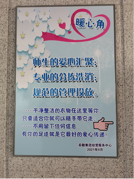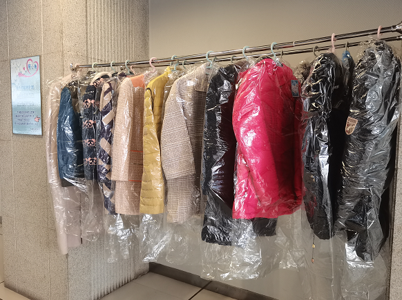所有衣物来均来自我校师生的爱心捐赠,经过精挑细选,通过专业的清洗和消毒,中心员工按季节将衣物进行分类整理并独立包装,挂在启航活动中心“暖心角”一隅。