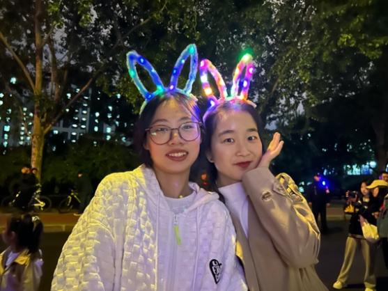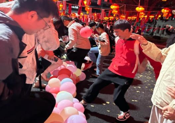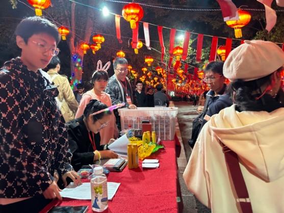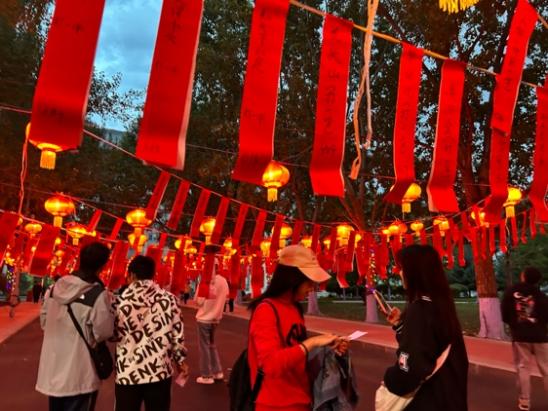 此时的郑和路上彩灯高悬,灯下挂满了公寓中心工作人员亲手写下的1000余个灯谜,灯谜内容涵盖校史轶闻、脑筋急转弯、民俗歇后语、生活常识等,内容丰富、知识性强、趣味十足。成串的灯谜与大红灯笼交相辉映,一片红海,喜气祥和。同学们三五成群的在此打卡拍照留念,猜灯谜兑换月饼,灯海中充满笑语欢声。