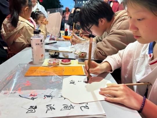 与此同时,“天文爱好者协会”、“非白书法协会”等学生社团也应邀来到活动现场。同学们在志愿者的引导下,通过天文望远镜观测月球,亲身体验追星赶月带来的乐趣;书法协会的同学现场书写制作手工团扇、书签等中国味十足的礼品,深受大家喜爱,使同学们亲身感受到了中华传统文化的无穷魅力。