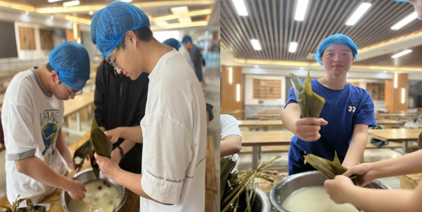 在食堂工作人员的耐心指导下,同学们系统地学习了泡粽叶、处理糯米、包扎粽子等劳动技巧,并亲自动手实践。大家分工合作,相互帮助,共同完成了一个个美味可口的作品,活动现场粽香四溢,充满了欢声笑语。