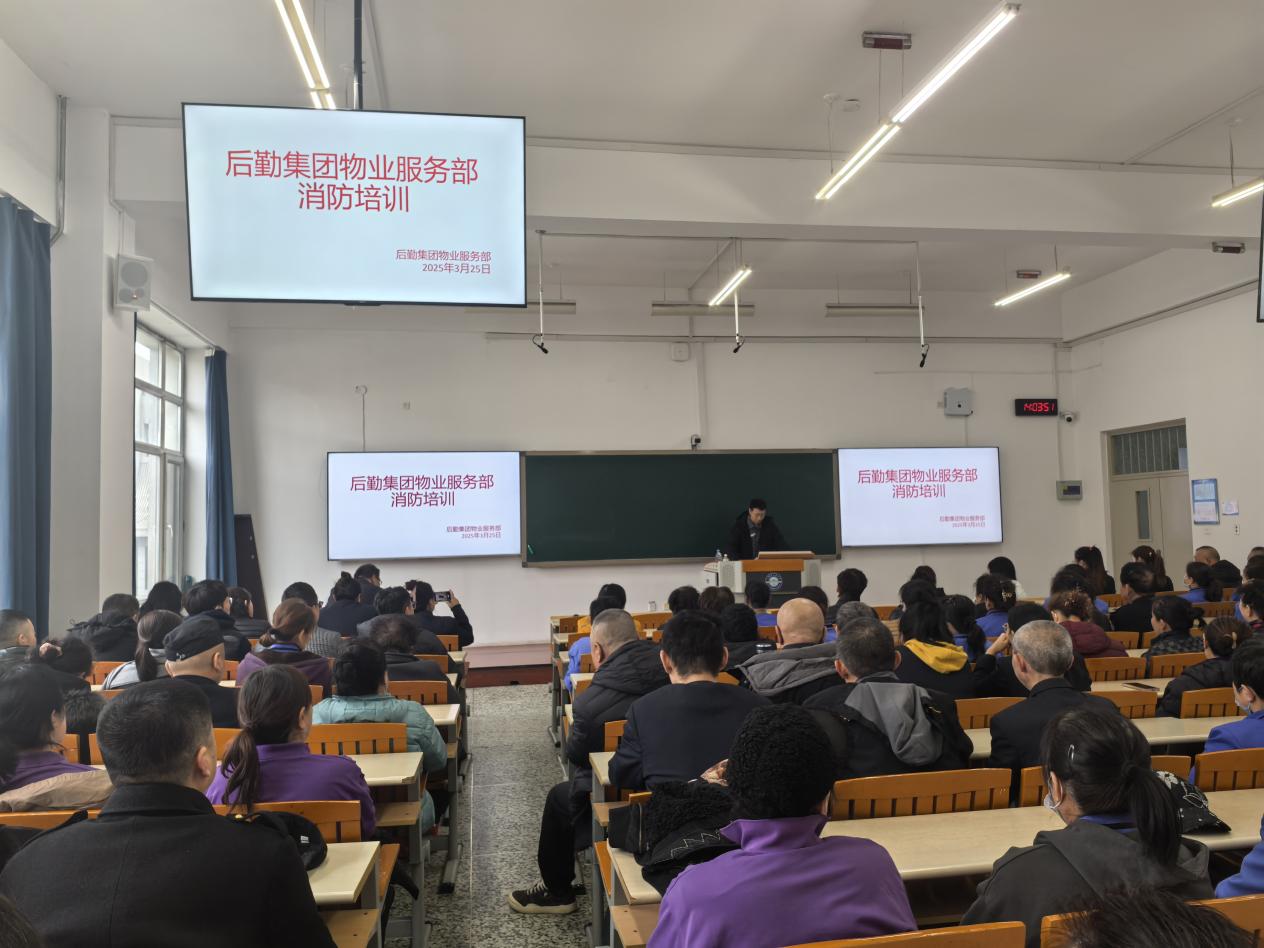 为进一步提升消防安全管理水平,增强员工应急处置能力,物业服务部在2025年3月25日组织了一场消防知识培训和实战演练活动,特邀校安全保卫处的黄国庆老师担任主讲,来自物业服务部各岗位的100余名员工齐聚一堂,共同学习消防安全知识。